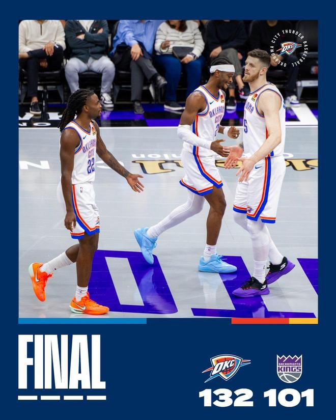 第4節,米切爾連續送出助攻,OKC依靠著團隊作戰,得以將分差擴大至34分,比賽早早失去瞭懸念。薩克拉門托追分乏力,最終,雷霆以132比101完勝對手。