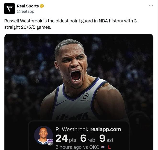 此役,威少還創下瞭紀錄。數據顯示,威少已經連續三場砍下至少20分5板5助攻,為做到這點歷史最老後衛(36歲361天)。